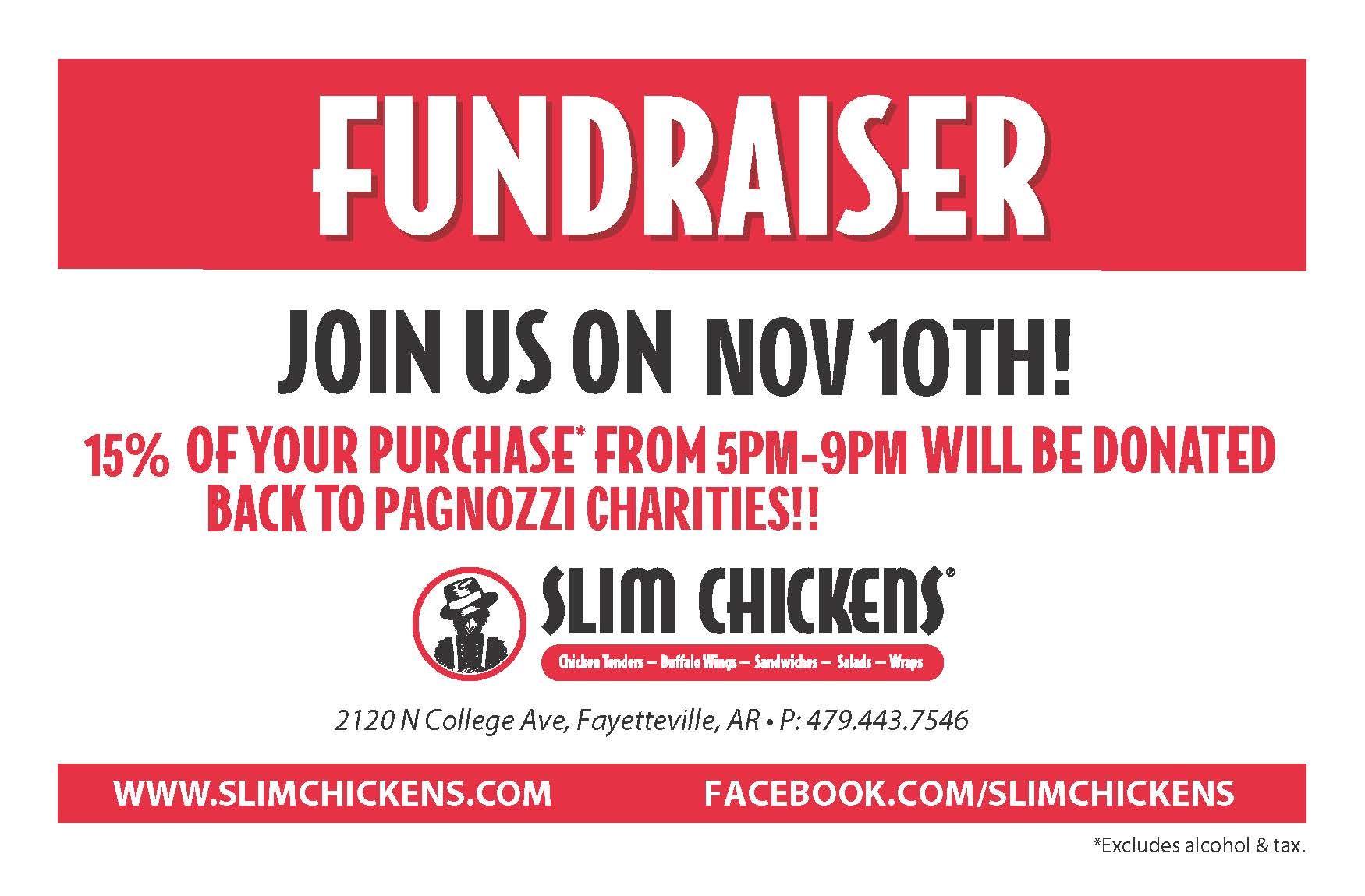 Join us at Slim Chickens on Thursday, November 10th 5-9pm. Be sure to say you are there for Pagnozzi Charities when ordering!! In fact, even better....print this page and take it with you. 15% of proceeds will benefit Pagnozzi Charities.