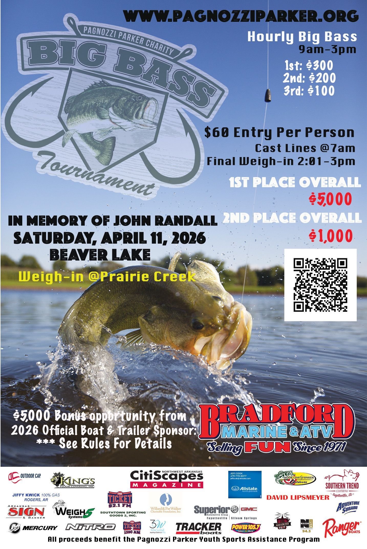 Join us for the 14th Annual Pagnozzi Parker Charity Big Bass Tournament on Saturday, April 11th. The tournament will take place on Beaver Lake with weigh-in at Prairie Creek. Hourly cash prizes for 1st, 2nd, & 3rd place ($300, $200, $100) plus payouts for 1st place overall ($5,000) & 2nd place overall ($1,000). $60 per fisherman. Click the link below to view the official tournament rules. Plus we now have a Youth Division that will payout Youth Overall 1st, 2nd, & 3rd place.